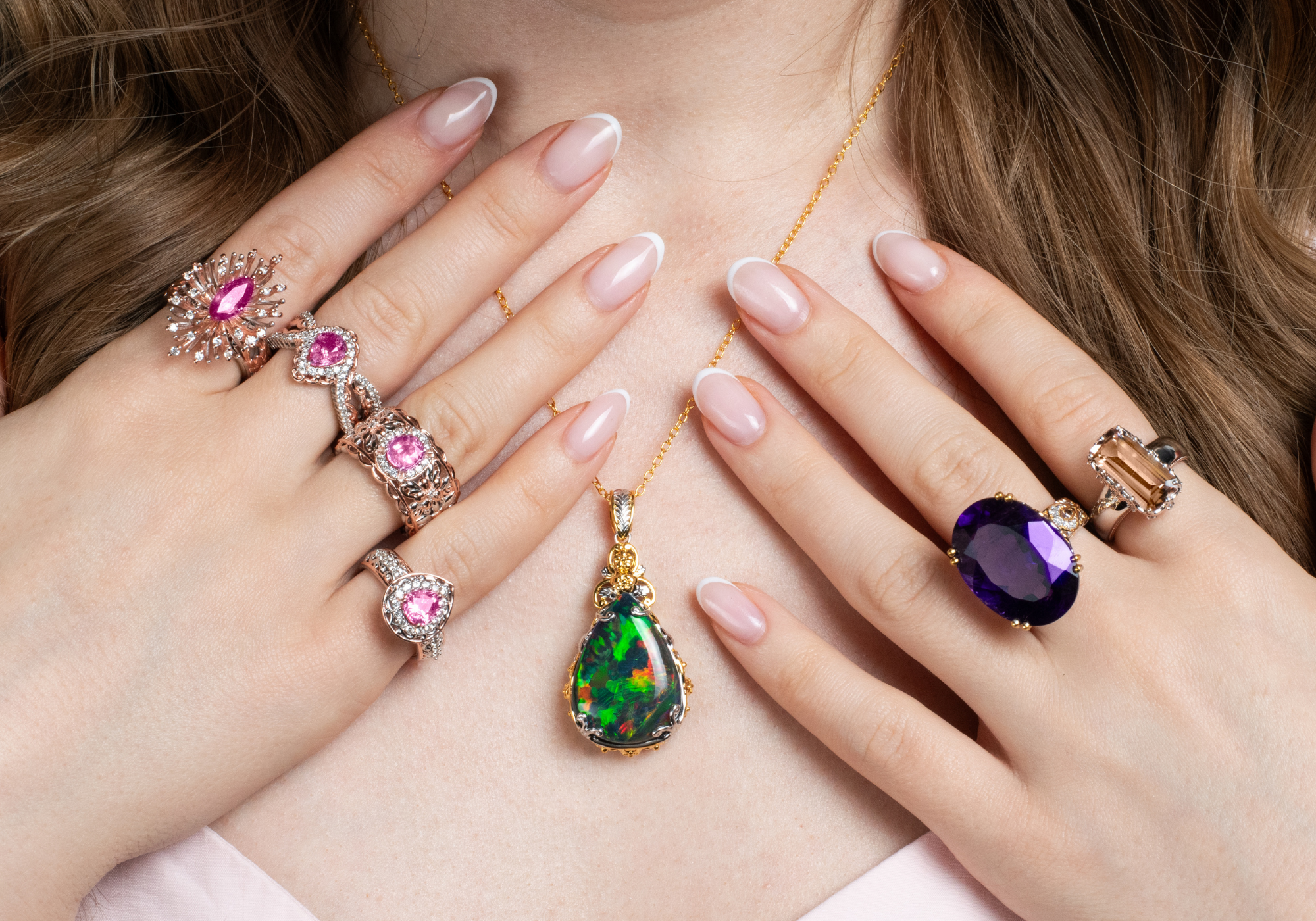 "Lovely. Intricate metal-work. Bright pink sapphire accent stones. A pastel palette that reminds me Spring will come again." - Mary