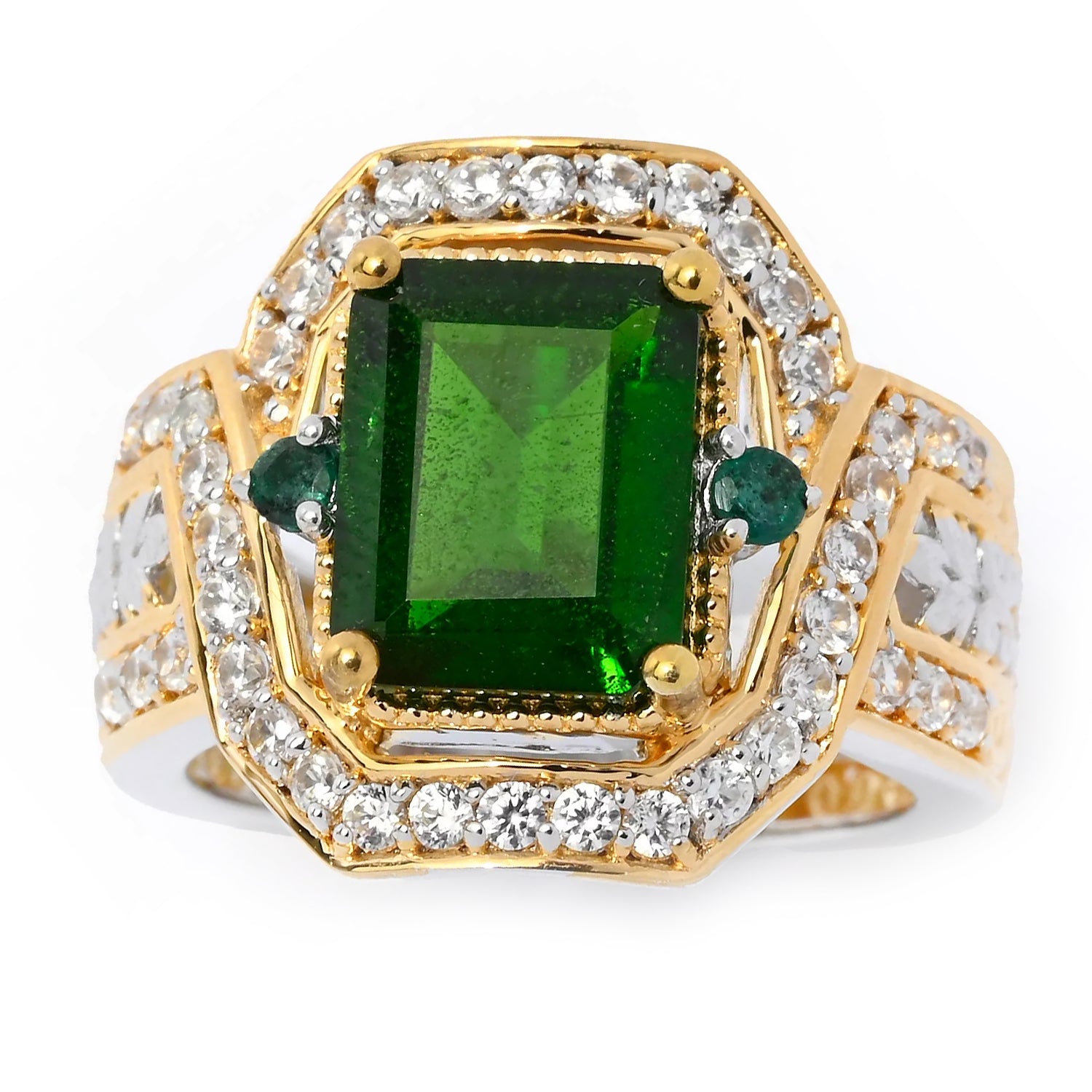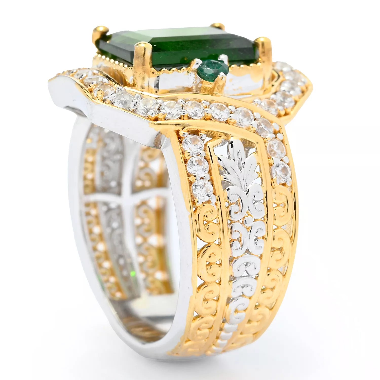 This exquisite Gems en Vogue ring features Chrome Diopside accented by White Zircon. Crafted of 24k yellow gold embraced sterling silver and palladium with a beautifully-constructed undergallery, this ring shines with a highly polished finish.