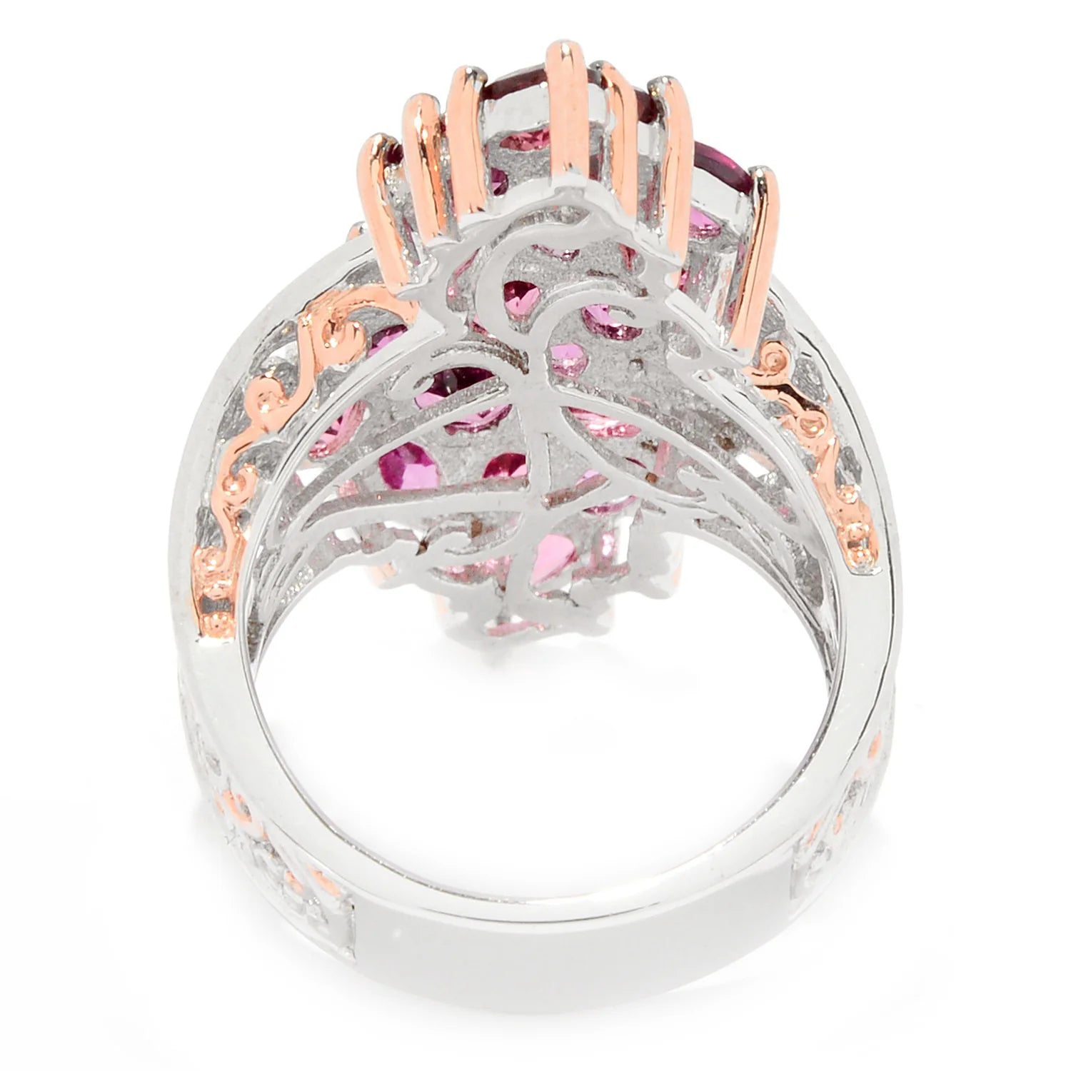 This exquisite Gems en Vogue ring features Rhodolite and Pink Tourmaline. Crafted of 18K rose gold embraced sterling silver and palladium with a beautifully-constructed undergallery this ring shines with a highly polished finish.