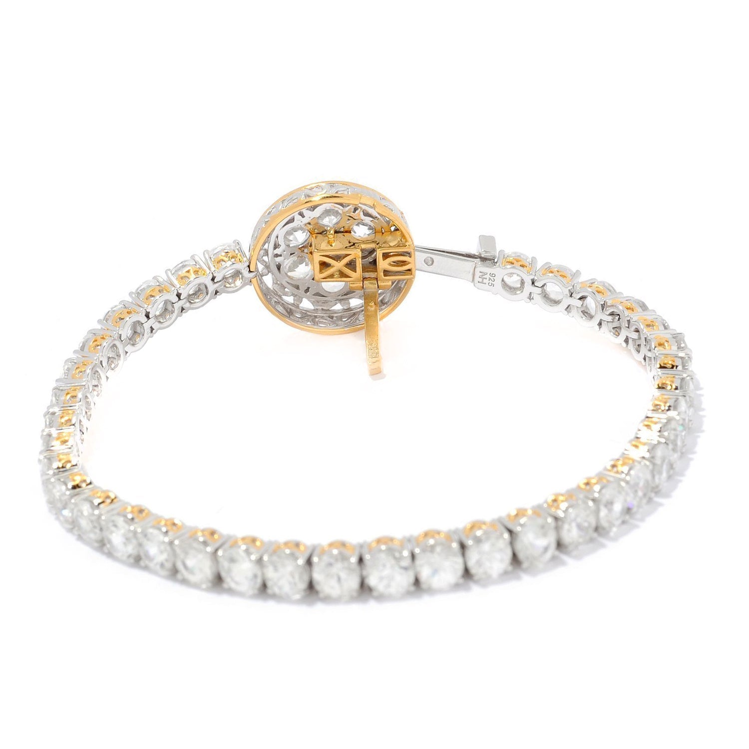 This exquisite Gems en Vogue tennis bracelet features white zircon. Crafted of 24k yellow gold embraced sterling silver and palladium with a beautifully-constructed undergallery this bracelet shines with a highly polished finish.