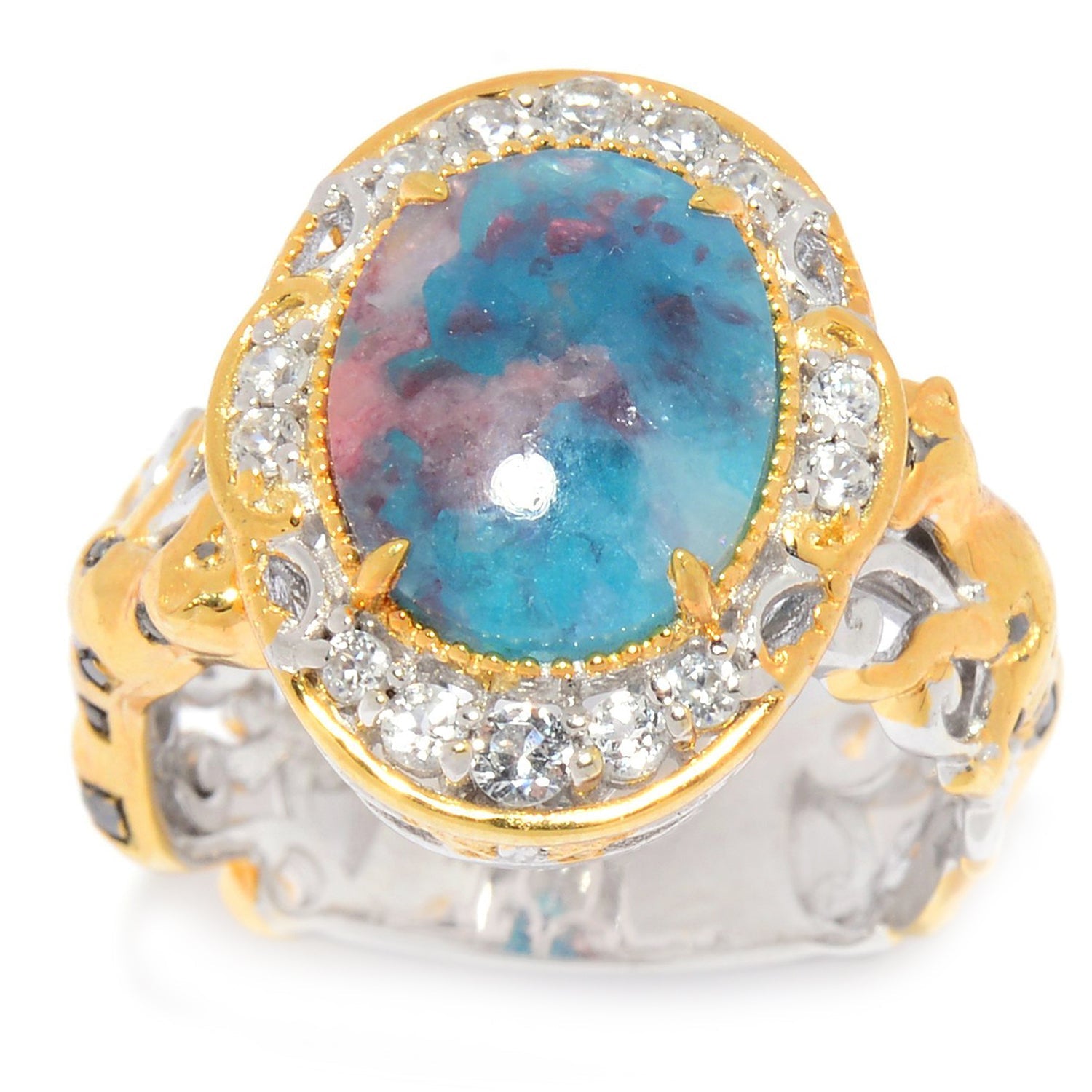 This exquisite Gems en Vogue ring features Paraiba Tourmaline accented by White Zircon. Crafted of 24k yellow gold embraced sterling silver and palladium with a beautifully-constructed undergallery this ring shines with a highly polished finish.
