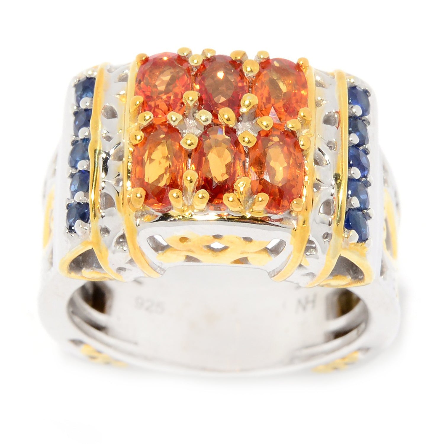 This exquisite Gems en Vogue ring features Orange Sapphire accented by Blue Sapphire. Crafted of 24k yellow gold embraced sterling silver and palladium with a beautifully-constructed undergallery, this ring shines with a highly polished finish.