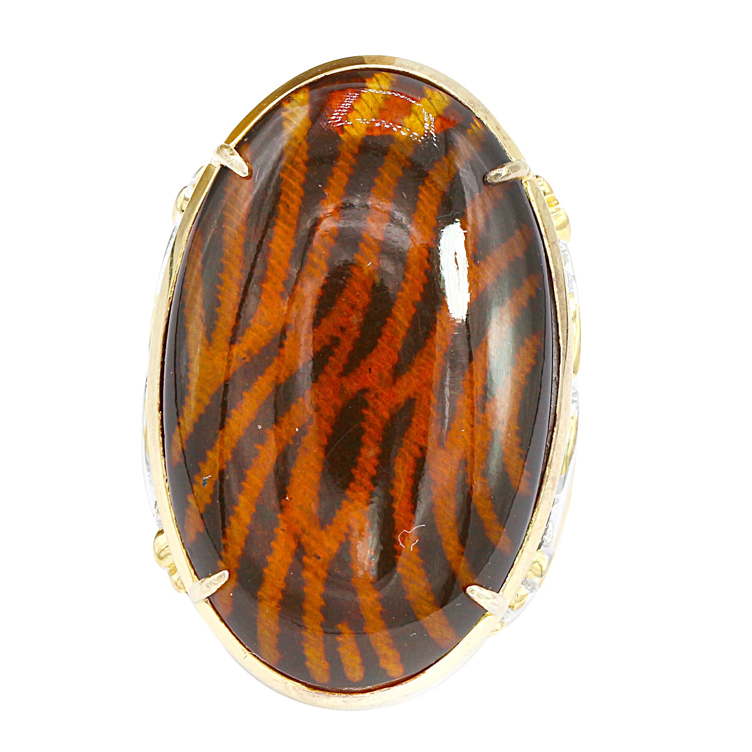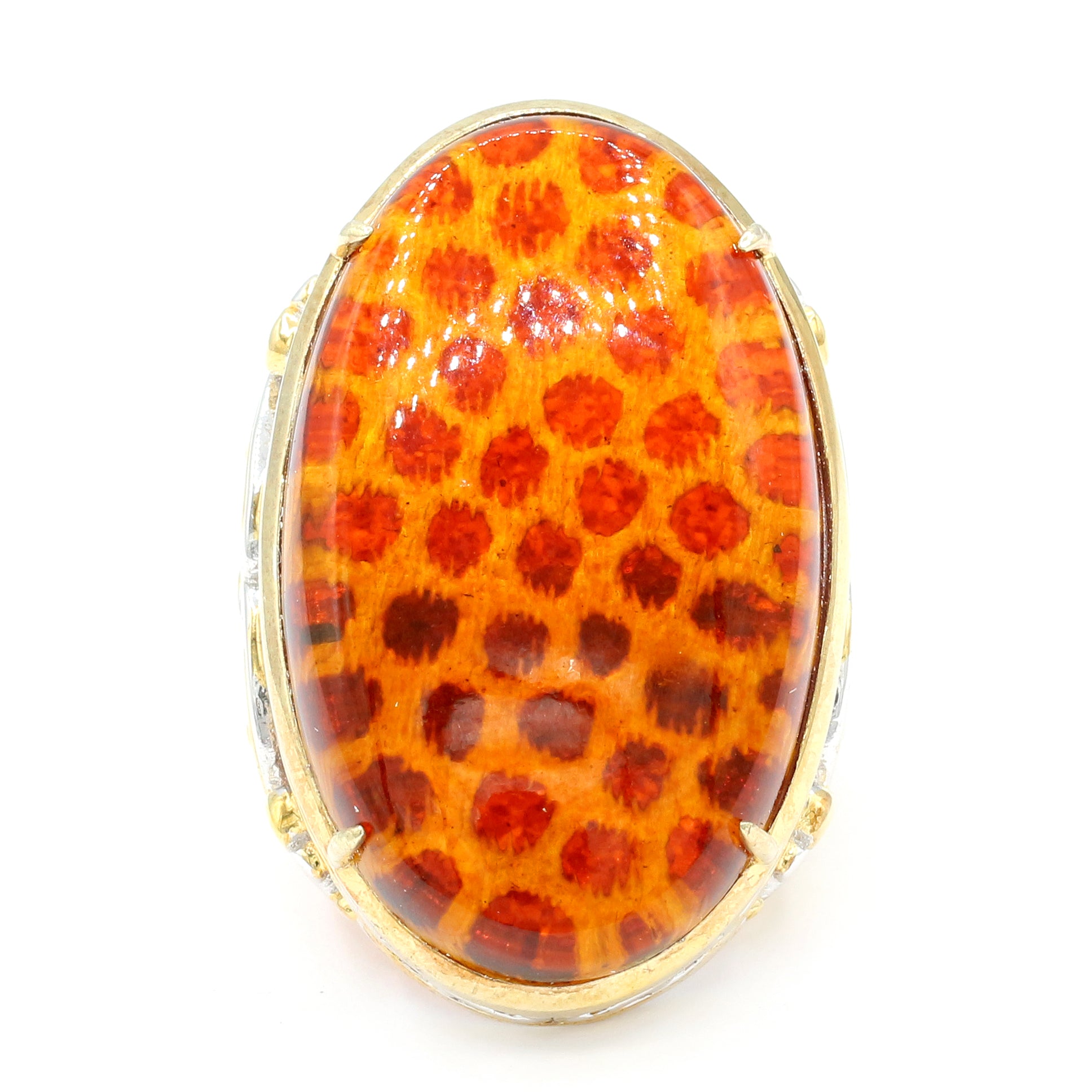 This exquisite Gems En Vogue ring features Tiger, Leopard or Panther Print Amber accented by Orange Sapphire. Crafted of 24k yellow gold embraced sterling silver and palladium with a beautifully-constructed undergallery this ring shines with a highly polished finish.