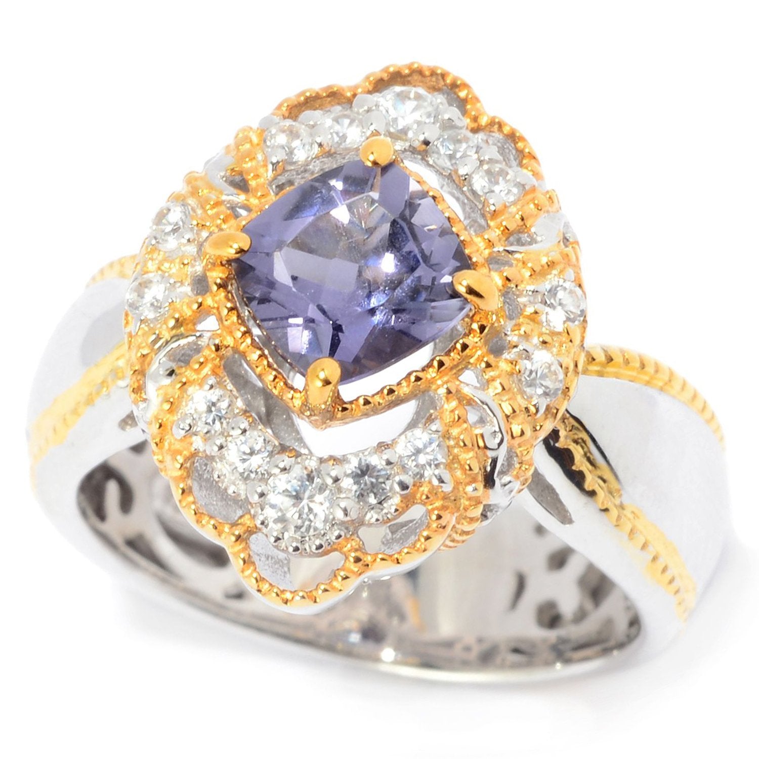 This exquisite Gems En Vogue ring features blue amethyst at the center with a floating halo of white zircons. Crafted of palladium silver with a beautifully-constructed undergallery and 24k yellow/rose gold-embraced detailing this ring shines with a highly polished finish.