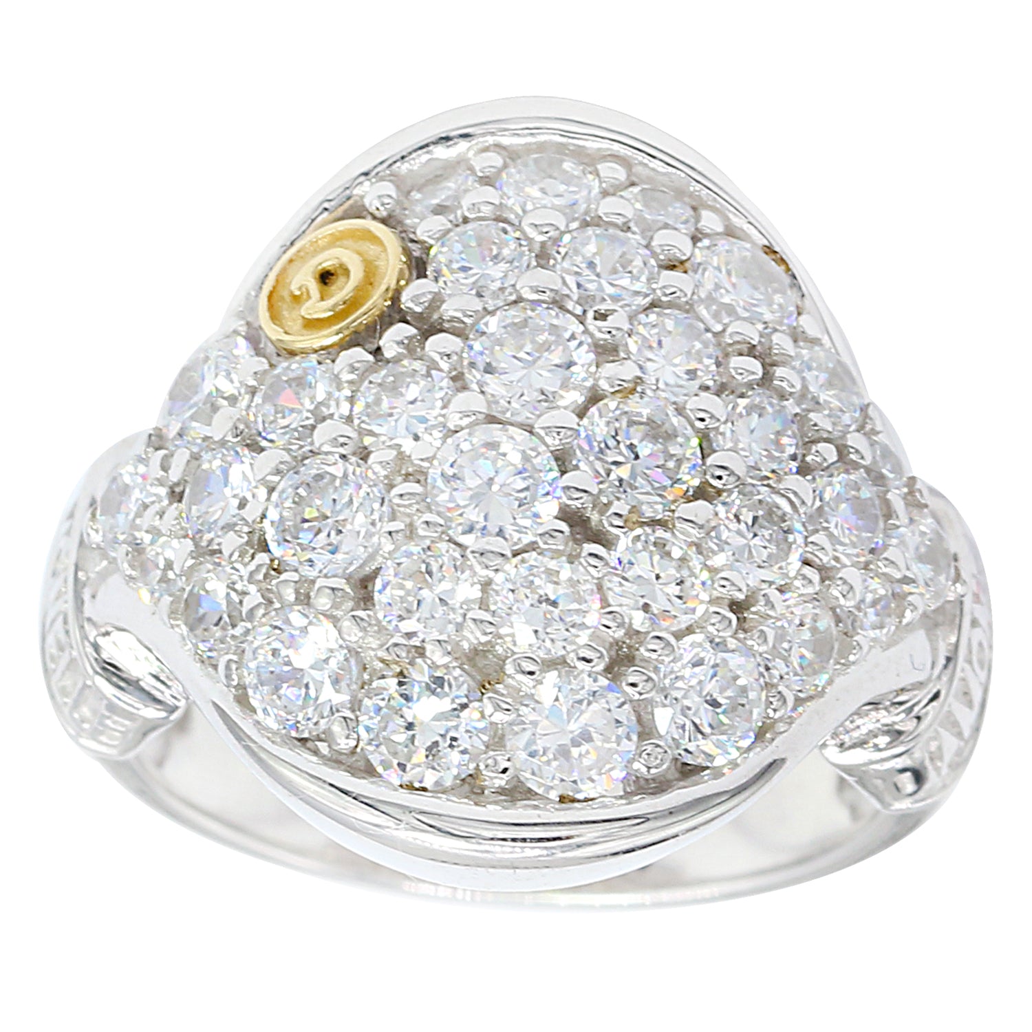 This exquisite signity ring features a collection of cubic zirconia. Crafted of 14k yellow gold and sterling silver this ring shines with a highly polished finish.