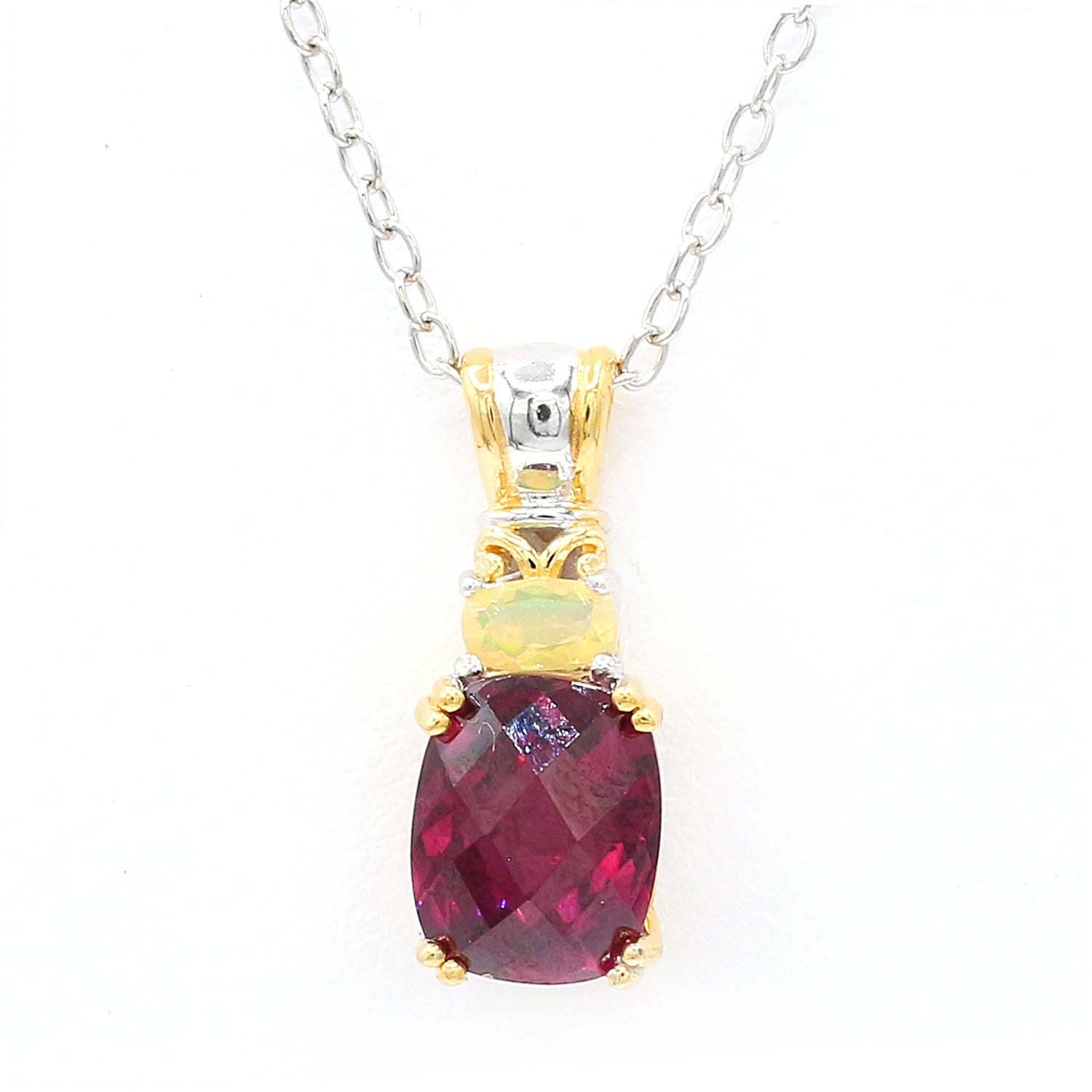 This exquisite Gems en Vogue pendant features Grape Garnet accented by Ethiopian Opal . Crafted of 24k yellow gold embraced sterling silver and palladium with a beautifully-constructed undergallery, this pendant shines with a highly polished finish.
