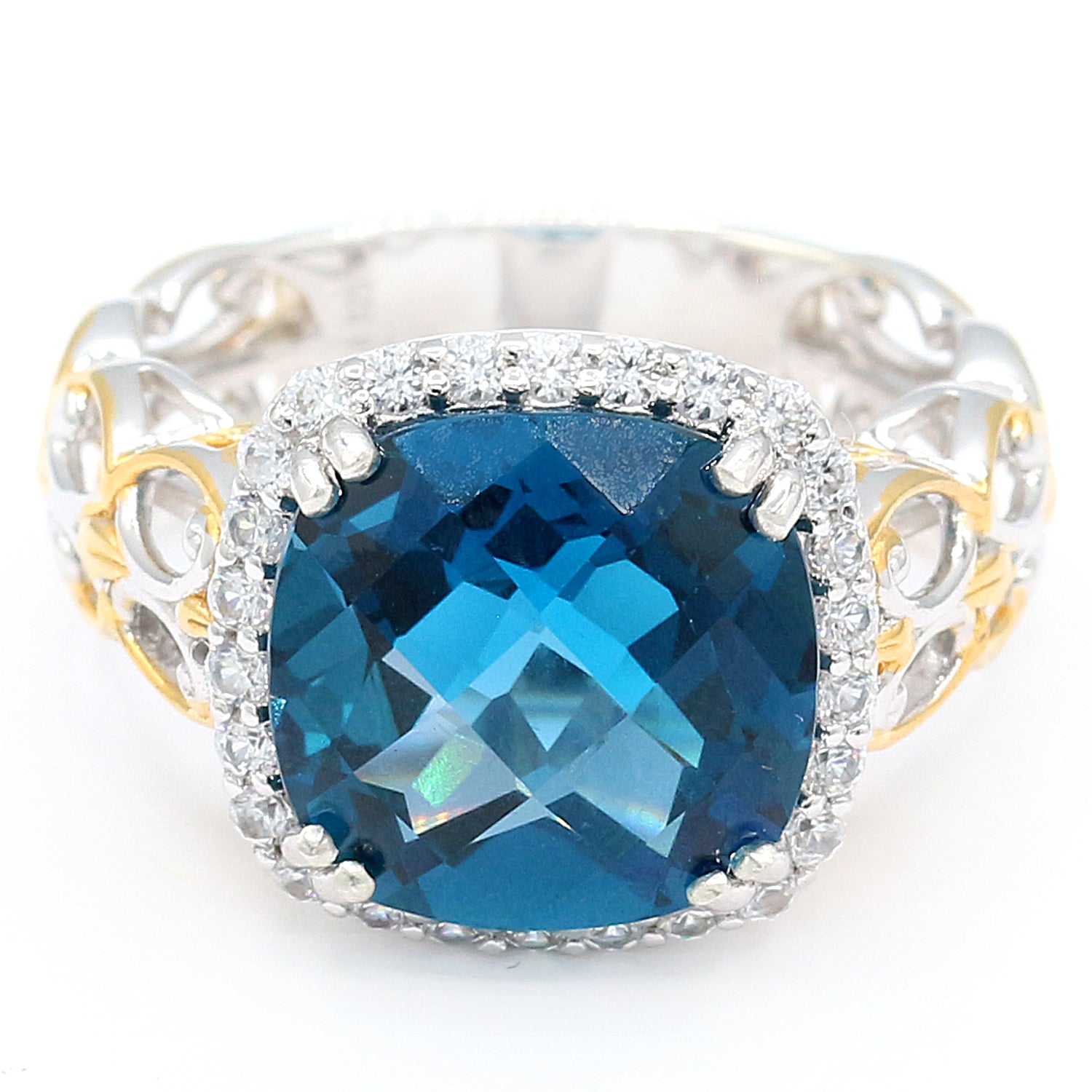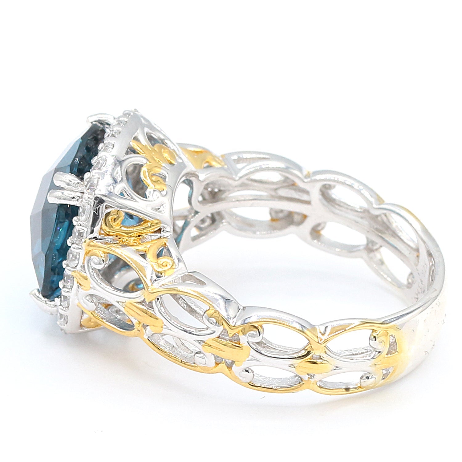 This exquisite Gems en Vogue ring features London Blue Topaz accented by White Zircon. Crafted of 24k yellow gold embraced sterling silver and palladium with a beautifully-constructed undergallery, this ring shines with a highly polished finish.