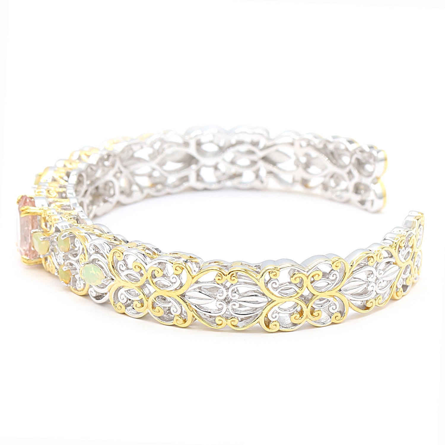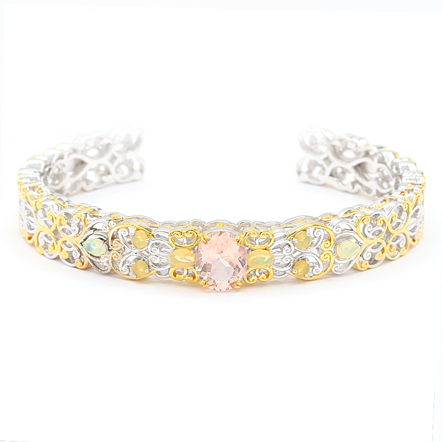 This exquisite Gems en Vogue bracelet features Morganite accented by Ethiopian Opal. Crafted of 24k yellow gold embraced sterling silver and palladium with a beautifully-constructed undergallery, this bracelet shines with a highly polished finish.