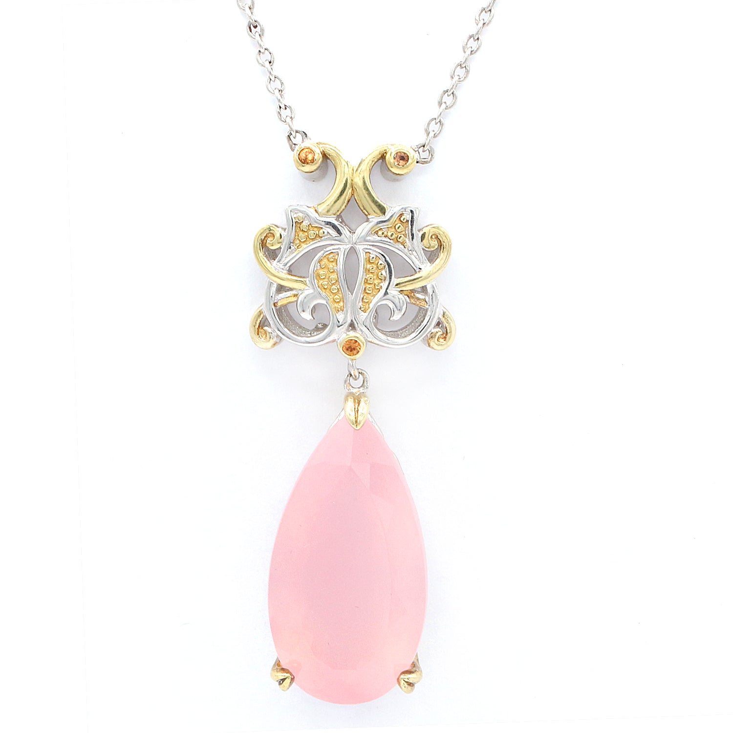 This exquisite Gems en Vogue necklace features Rose Quartz accented by Citrine. Crafted of 24k yellow gold embraced sterling silver and palladium with a beautifully-constructed undergallery this necklace shines with a highly polished finish.