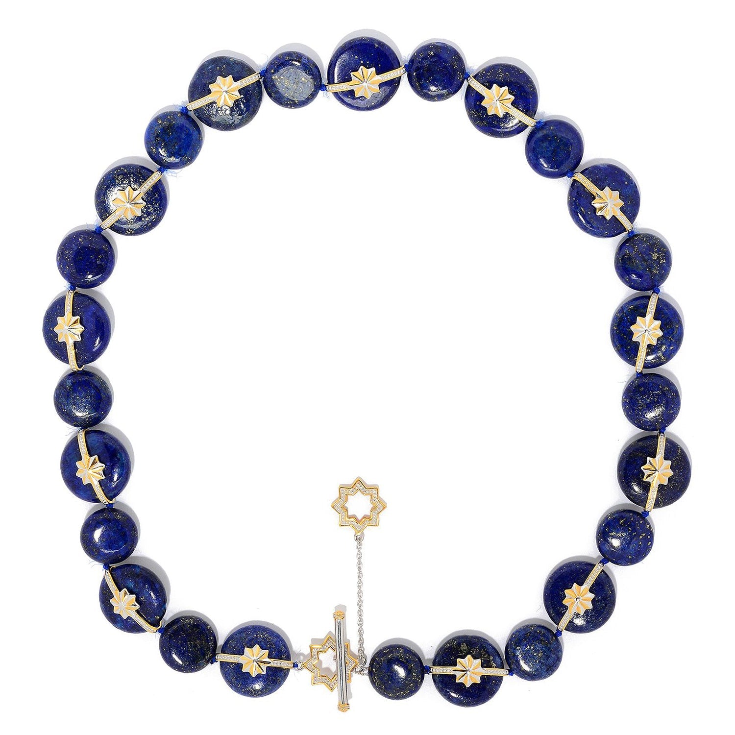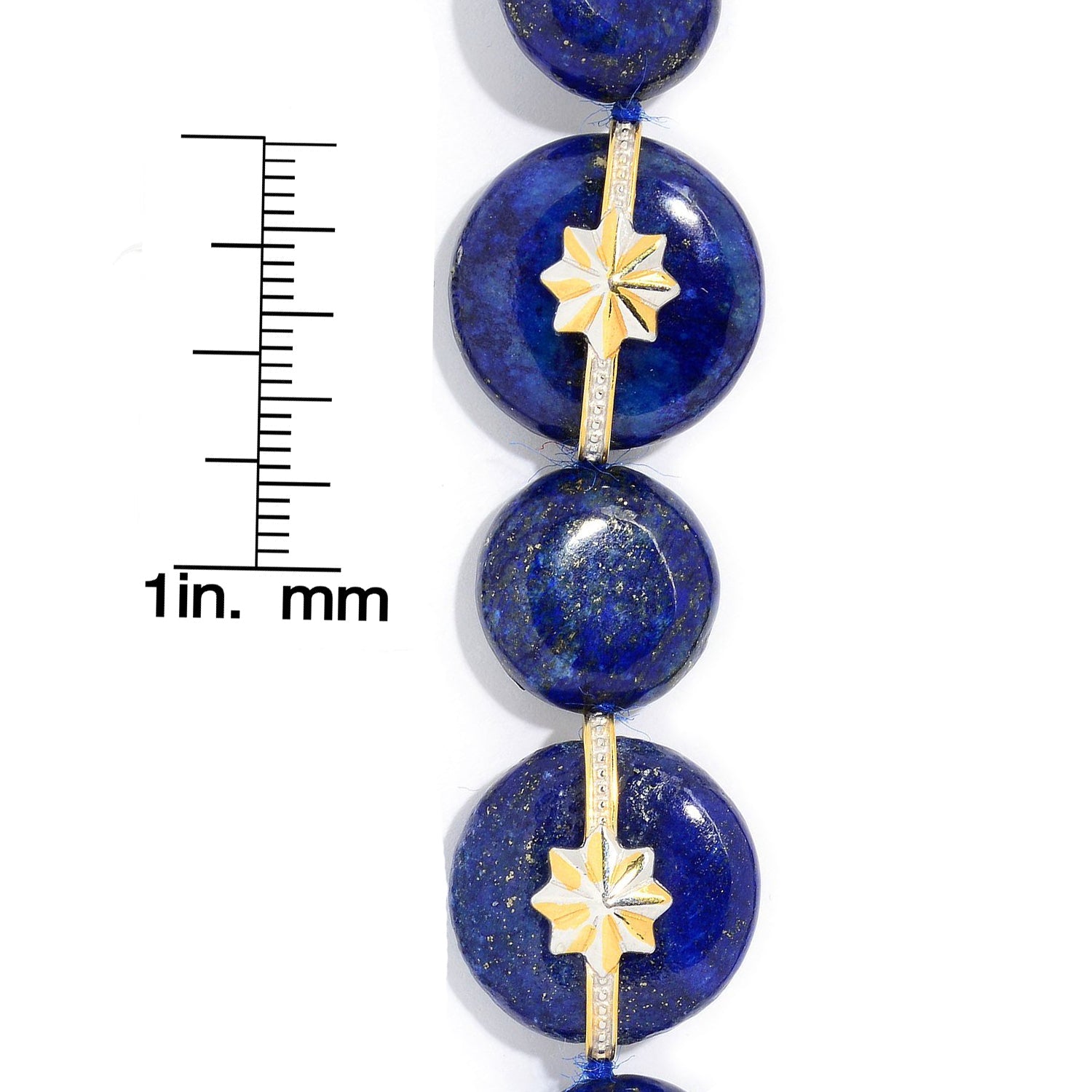 This exquisite Gems En Vogue necklace features a collection of lapis disks with star detailed cages. Crafted of palladium silver and 18k yellow gold-embraced detailing this necklace shines with a highly polished finish.