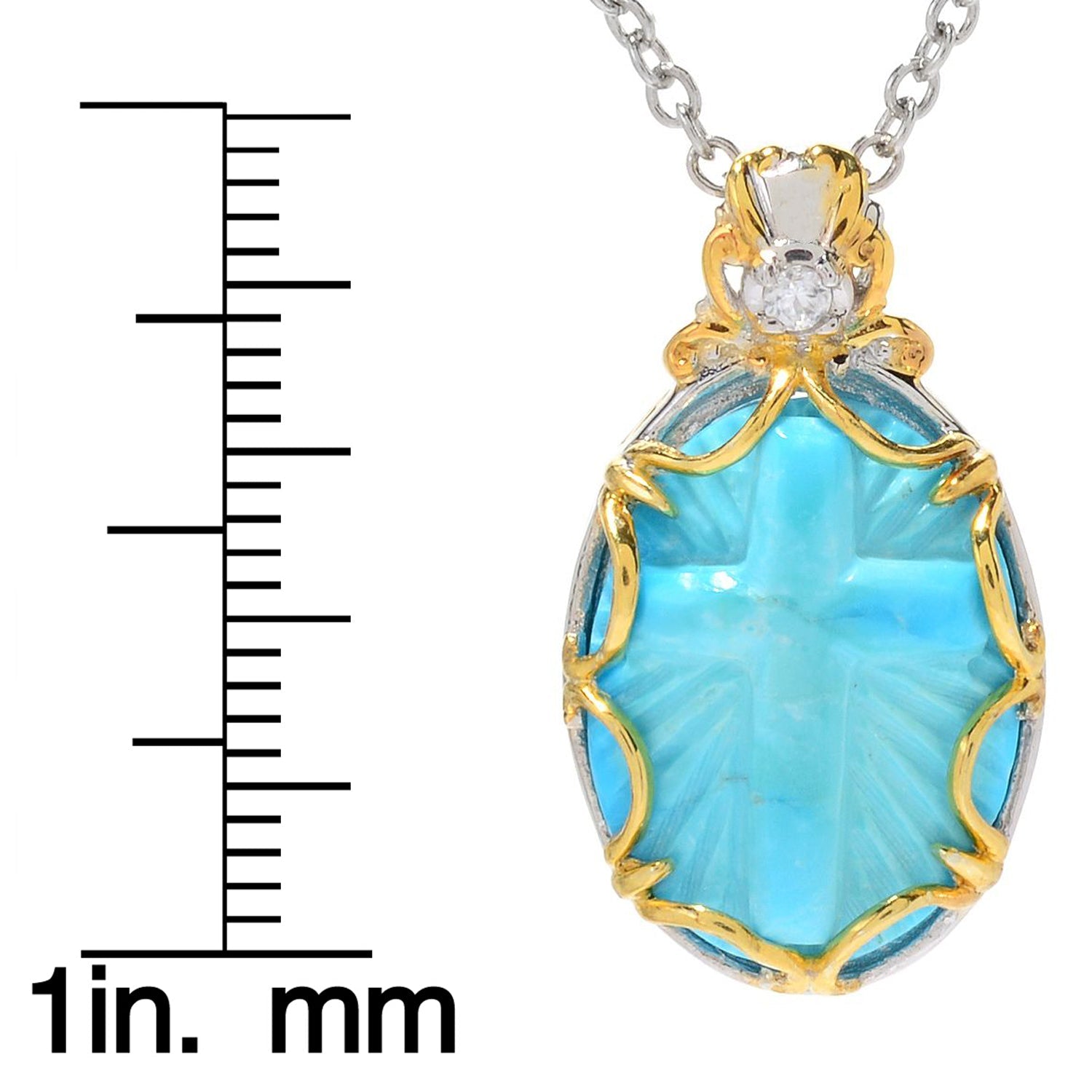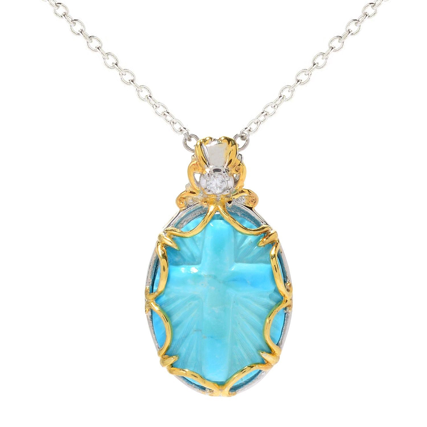 This exquisite Gems En Vogue pendant features a reverent Kingman turquoise cabochon while a single white zircon accents the bail with choice of Star of David or Cross design. Crafted of palladium silver with a beautifully-constructed undergallery and 24k yellow gold-embraced detailing this pendant shines with a highly polished finish.